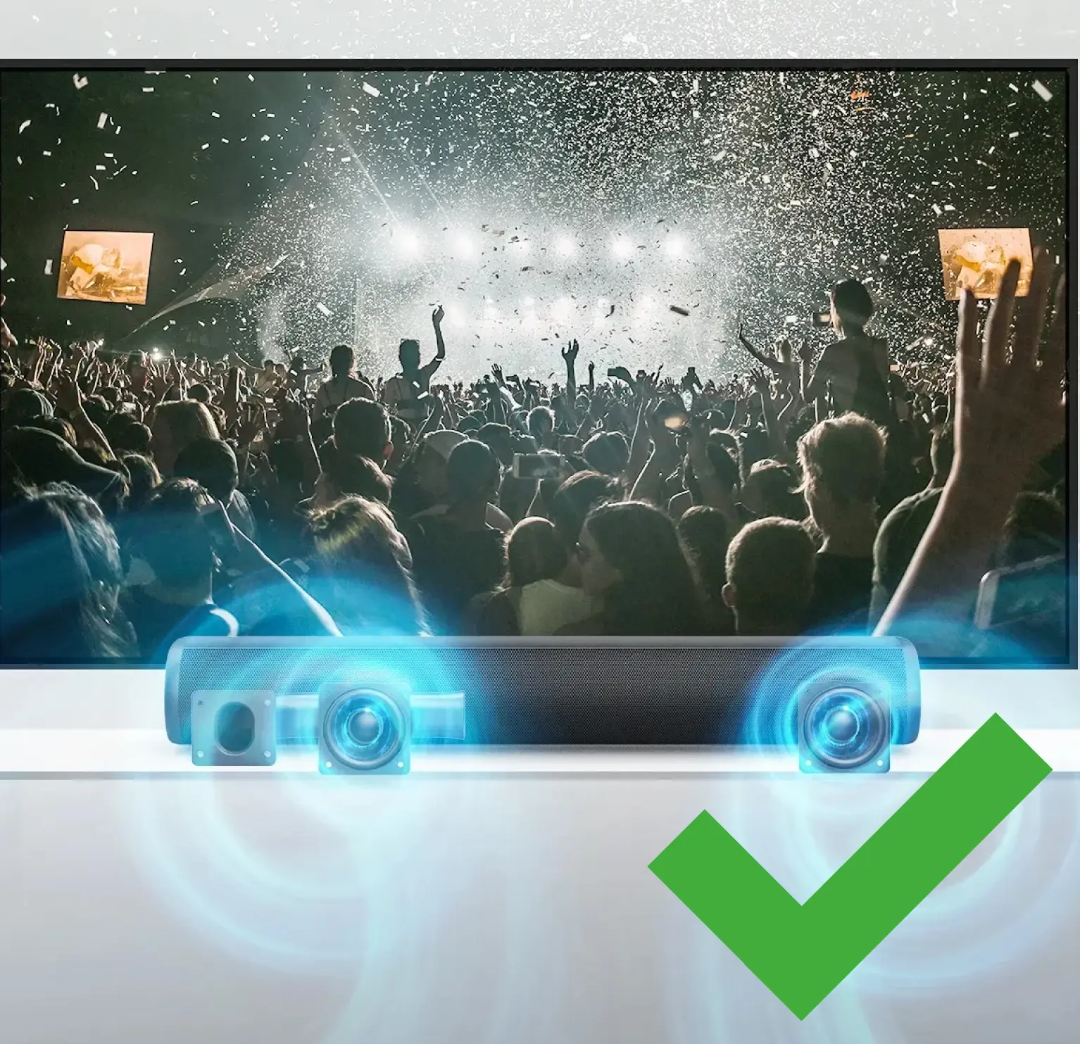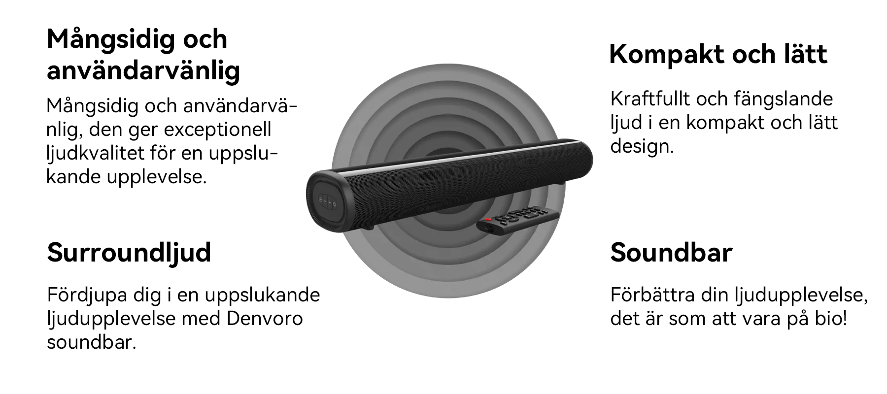 Denvoro erbjuder kraftfull 40 W omnidirektionell uteffekt, ett 3.1-kanalssystem samt en trådlös subwoofer, vilket gör denna soundbar till det perfekta komplementet till din TV.